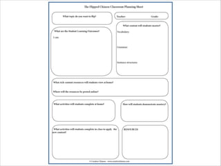This document provides guidance on implementing a flipped classroom model. It discusses four key steps: [1] choosing a topic and writing student learning outcomes; [2] locating content-rich resources for students; [3] including activities for students to complete at home; and [4] providing in-class activities for students to apply what they have learned. The document contains examples and templates to help teachers plan flipped lessons, locate online content, design homework assignments, and structure classroom time for active learning. It aims to offer a structured approach for teachers to transition to the flipped model.