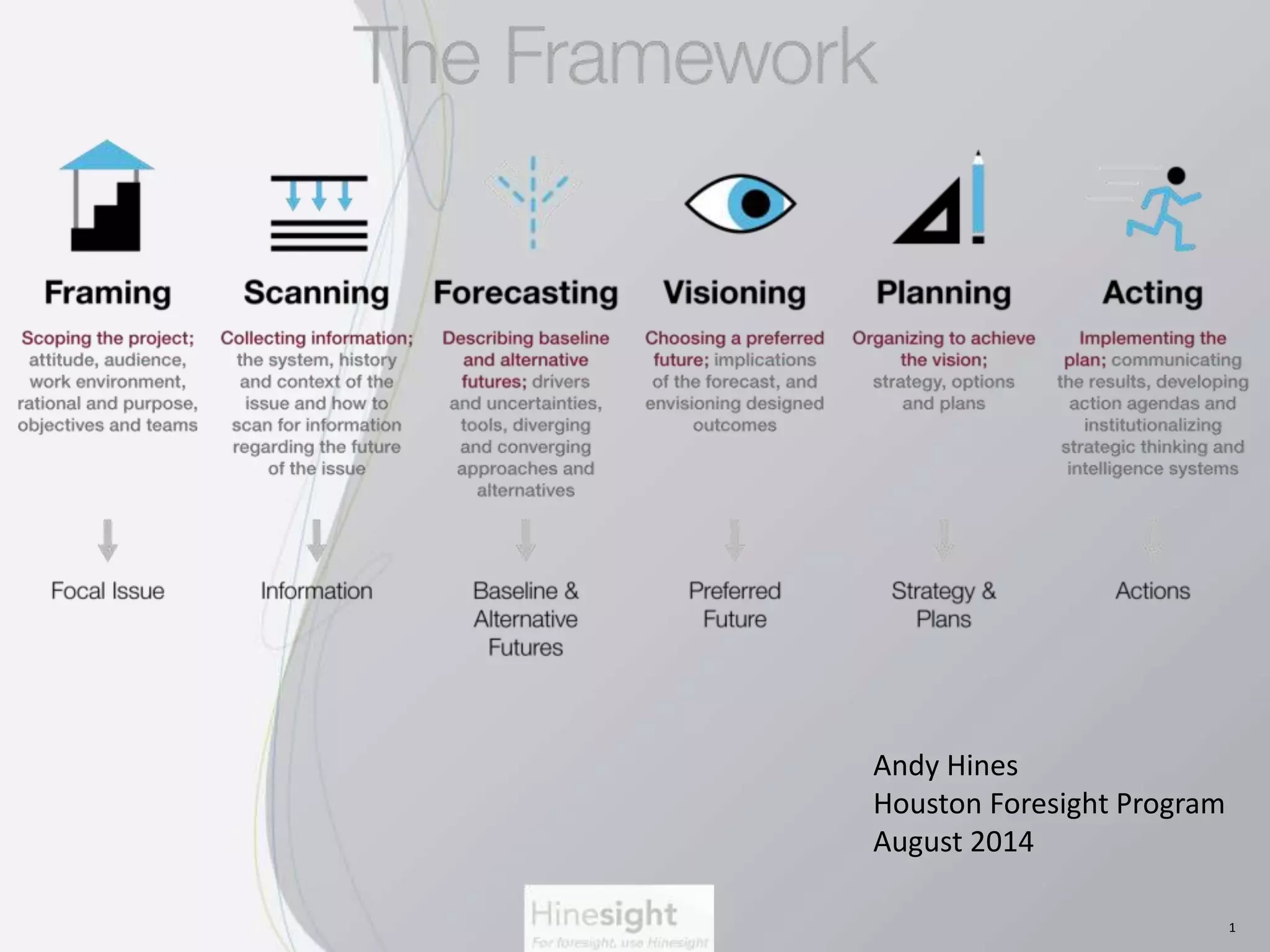 The document outlines six activities that can help organizations with foresight: framing, scanning, forecasting, visioning, planning, and acting. Framing involves adjusting attitudes, understanding objectives, and creating strategic work environments. Scanning requires mapping systems, studying history, scanning environments, and involving colleagues. Forecasting identifies drivers and uncertainties to generate and prioritize alternative futures. Visioning identifies implications and assumptions to develop visionary thinking. Planning develops strategic options. Acting communicates results, creates action agendas and intelligence systems, and institutionalizes strategic thinking. The document provides percentages of benefits for each activity and contact information for Andy Hines of the University of Houston Foresight program.