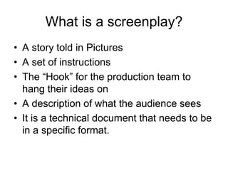 1) A screenplay is a technical document that tells a story in pictures through sluglines, action, character names, and dialogue. It provides instructions for what the audience will see on screen.