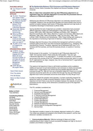The document discusses the relationship between ITIL processes and IT/business alignment. It summarizes previous research showing a positive correlation between alignment and competitive advantage. The author conducted research analyzing the correlation between maturity levels of 10 ITIL processes and 6 dimensions of strategic alignment. Key findings showed several ITIL processes correlated with higher maturity in certain alignment dimensions, such as financial management correlating with business value and governance maturity. However, the research did not find all ITIL processes influence all dimensions of alignment.