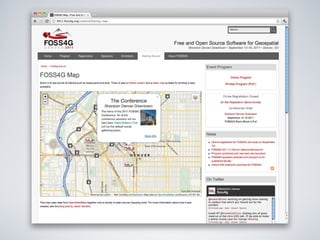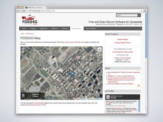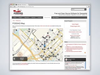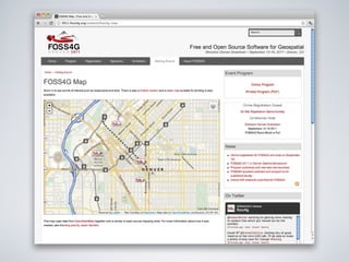 The document discusses several open source geo tools that can be used to create a simple web map, including Polymaps and Leaflet. It provides details on MapQuest OSM tiles and custom tiles that can be used as basemaps and are free to use with attribution. It also discusses tools for tile creation from OSM data like osm2pgsql and PostGIS, tile styling with TileMill, and tile exporting and serving options like MBTiles and MapProxy. Finally, it provides an example of handling click events on the map and querying location data with GeoJSON.