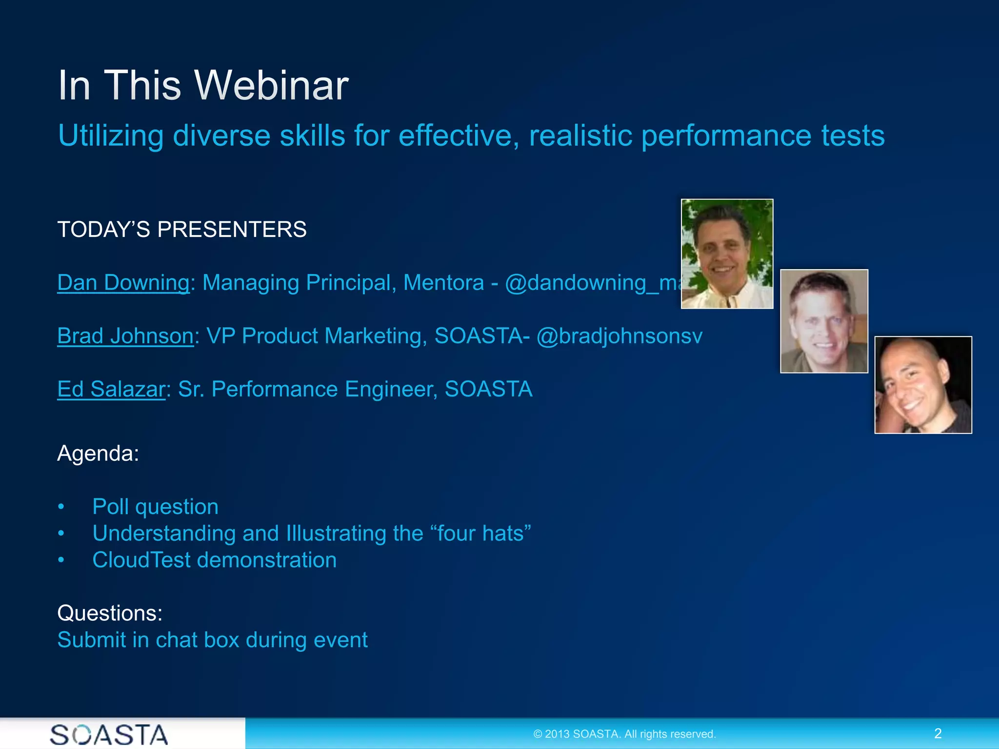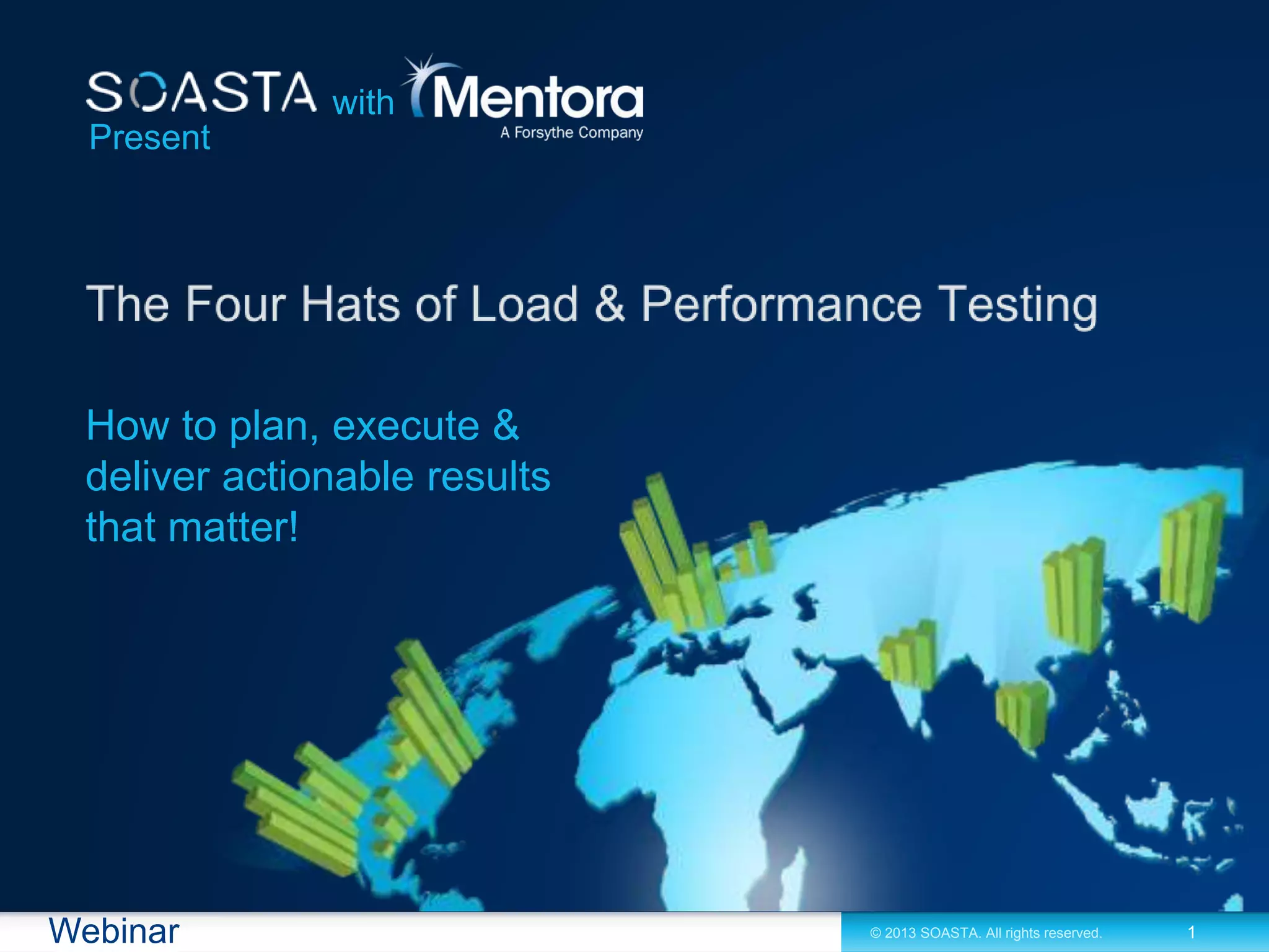 The document outlines a webinar on planning and executing effective performance testing, featuring presenters from Soasta and Mentora. It highlights Soasta's achievements in cloud-based testing solutions and emphasizes the importance of various roles in performance testing, including business analysts, developers, systems engineers, and data analysts. Key points include skills needed for each role and the significance of collecting, interpreting, and reporting performance data for actionable results.
