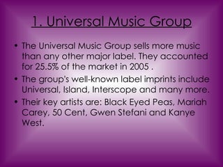 The document outlines the four major record labels - Universal Music Group, Sony BMG Music Entertainment, EMI Group, and Warner Music Group - and provides details on their market share in 2005, label imprints, and key artists. Universal Music Group had the largest market share at 25.5% while Warner Music Group had the smallest at 11.3%. The major label imprints and some of their iconic artists are also noted for each company.