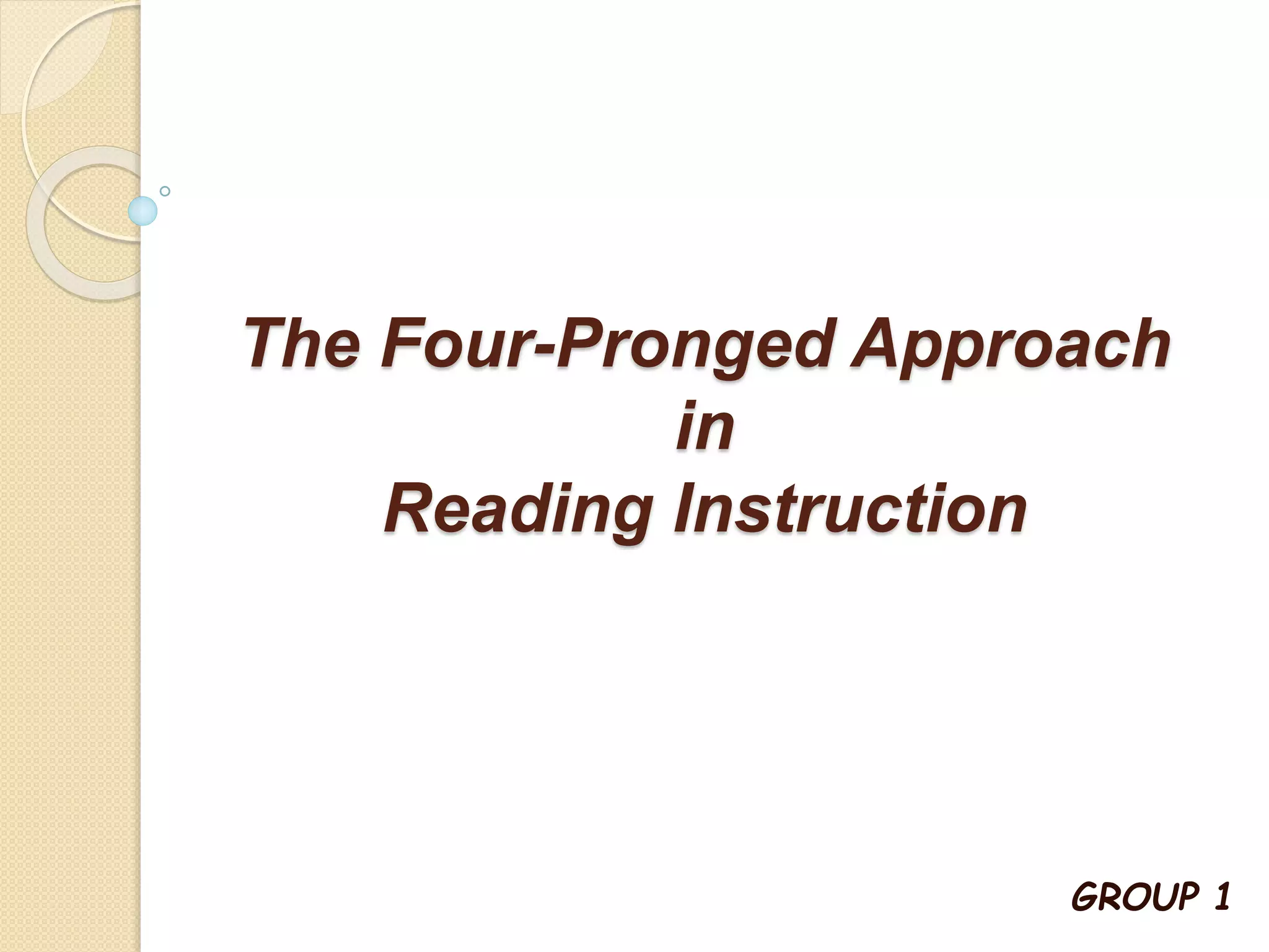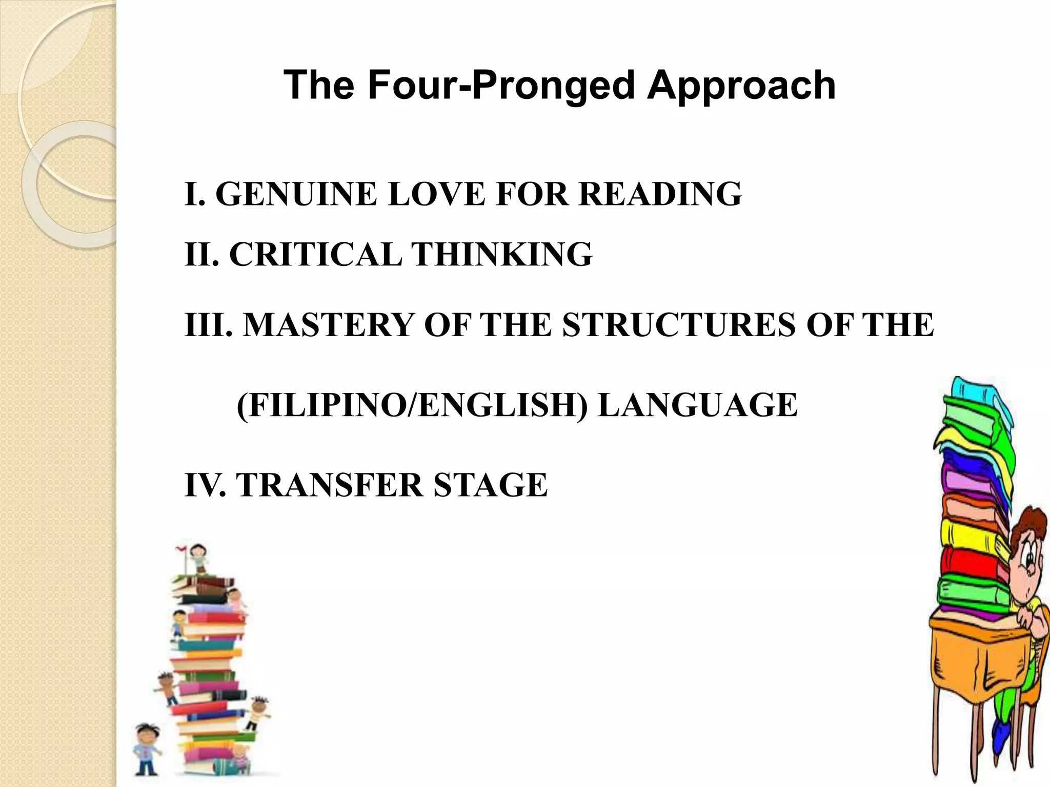 The document outlines a four-pronged approach to reading instruction consisting of developing a genuine love of reading, critical thinking skills, mastery of language structures, and applying reading skills in other contexts. It provides details on developing various reading comprehension skills such as understanding at the micro, integrated, macro, elaborative and metacognitive levels. It also describes teaching oral and silent reading, factors that influence comprehension, and taxonomy of cognitive and affective dimensions of reading.
