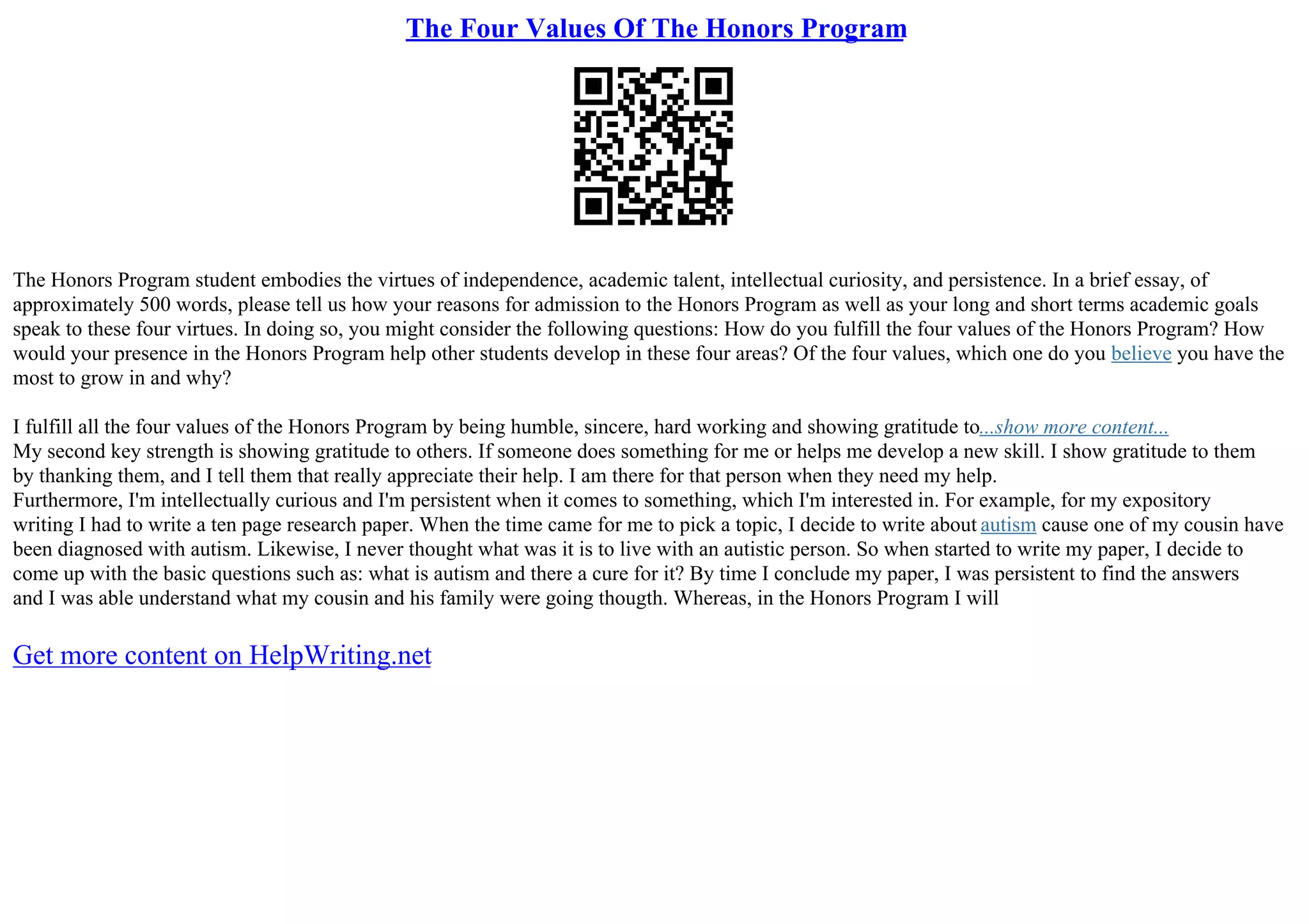The document discusses the four core values of the Honors Program: independence, academic talent, intellectual curiosity, and persistence. It prompts applicants to discuss in a 500-word essay how their reasons for applying to the program and their academic goals reflect these values. It suggests considering how the applicant fulfills the values, how their presence could help other students develop the values, and which value they have the most room to grow in.