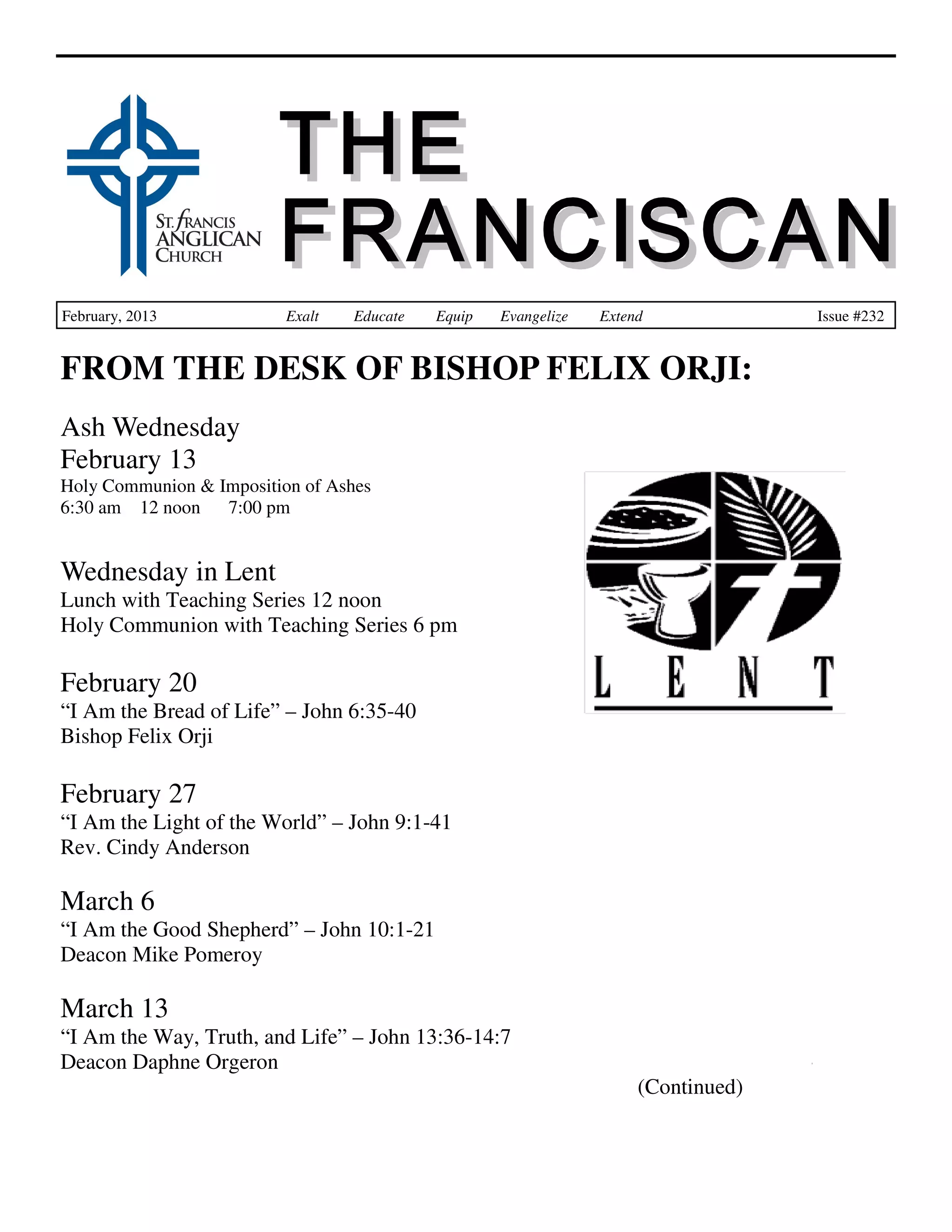 The document outlines the schedule and events for February and March 2013 at St. Francis church, including services, teachings for Lent, and Holy Week observances. It also shares a personal story of faith transformation involving a prayer shawl and explores the nature of worship beyond traditional services. Additionally, it contains information about various church activities, community support initiatives, and upcoming meetings.