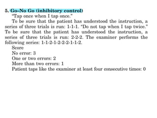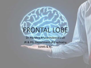 This document discusses the frontal lobe and its functional anatomy. It describes the case of Phineas Gage in 1848, whose frontal lobe injury changed his personality. The frontal lobe is the largest lobe and gives humans abilities like empathy, humor, and deception. The document outlines the various regions and circuits of the frontal lobe and their functions, like motor control, language, and executive functions. It also discusses assessments used to evaluate frontal lobe functions, like the Wisconsin Card Sorting Test and Tower of London Test.