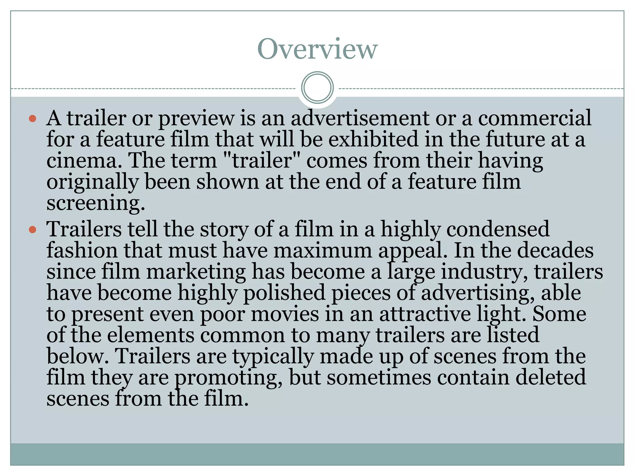 A film trailer is an advertisement that promotes an upcoming movie. Trailers condense the film's story into a highly polished piece that aims to attract audiences in a short time period. They showcase scenes and deleted scenes to inform viewers about the cast, genre, and plot in order to encourage people to see the film. Trailers are distributed on television, websites like YouTube and social media, and in cinemas. They utilize conventions like dramatic camera angles, music, and montages to build excitement and highlight the action and climax.