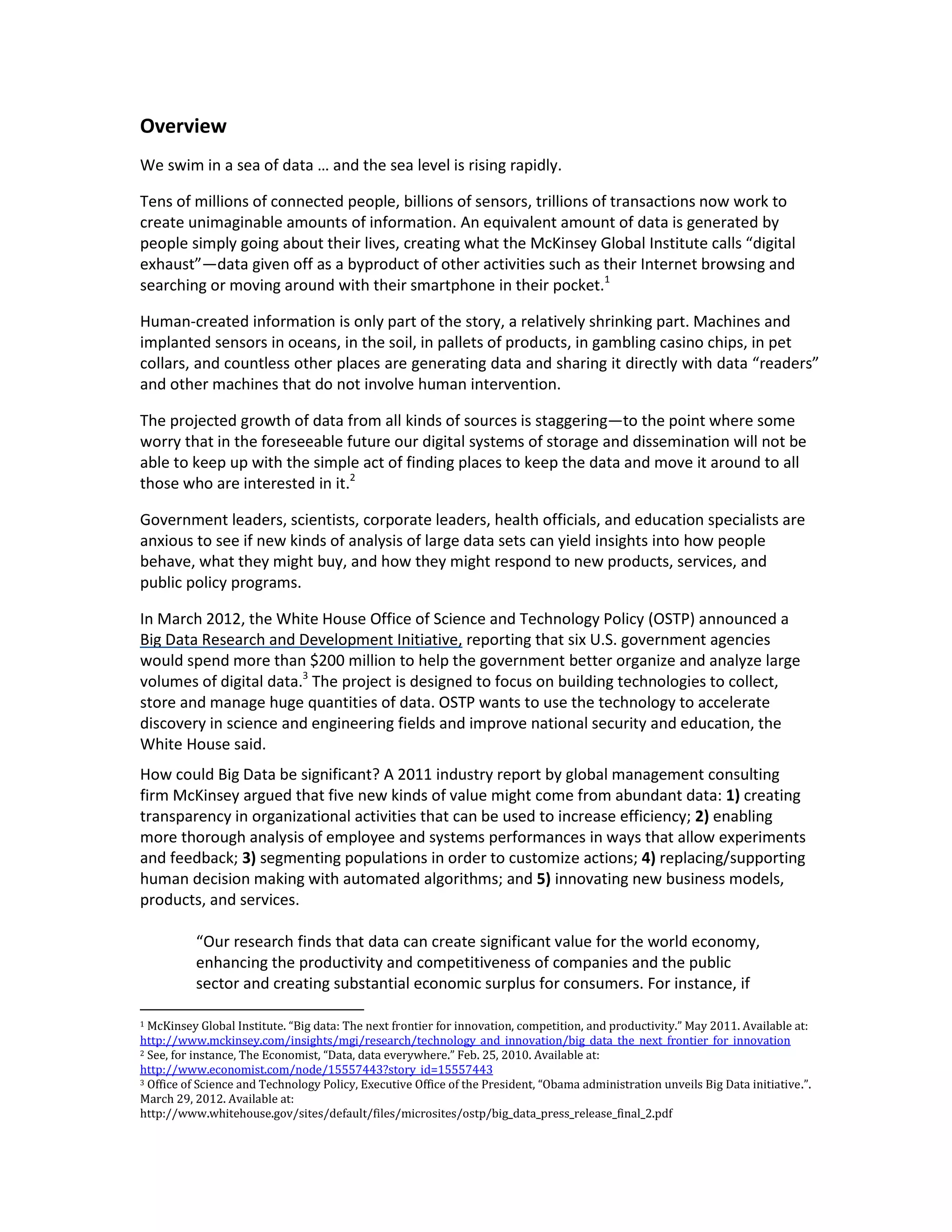 Experts express optimism about big data's potential to enhance productivity and improve organizational transparency, while also raising concerns about privacy and the capacity to analyze vast amounts of data wisely. A Pew Research Center study indicates a split opinion on the future impact of big data, with 53% of respondents believing it will improve societal intelligence by 2020, while 39% anticipate it could lead to significant problems. The document highlights both the transformative possibilities and the risks associated with the increasing reliance on big data in various sectors.