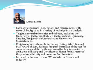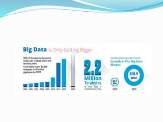 The document provides information about Ahmed Banafa's background and experience, including extensive experience in operations and management with a research background in various techniques and analysis. It also lists that he has taught at several universities and has received several awards for his work. It provides a brief introduction to big data and defines it as large and complex structured and unstructured data that cannot be processed by traditional database tools. It also discusses some of the roots and key aspects of big data like volume, velocity, and variety.
