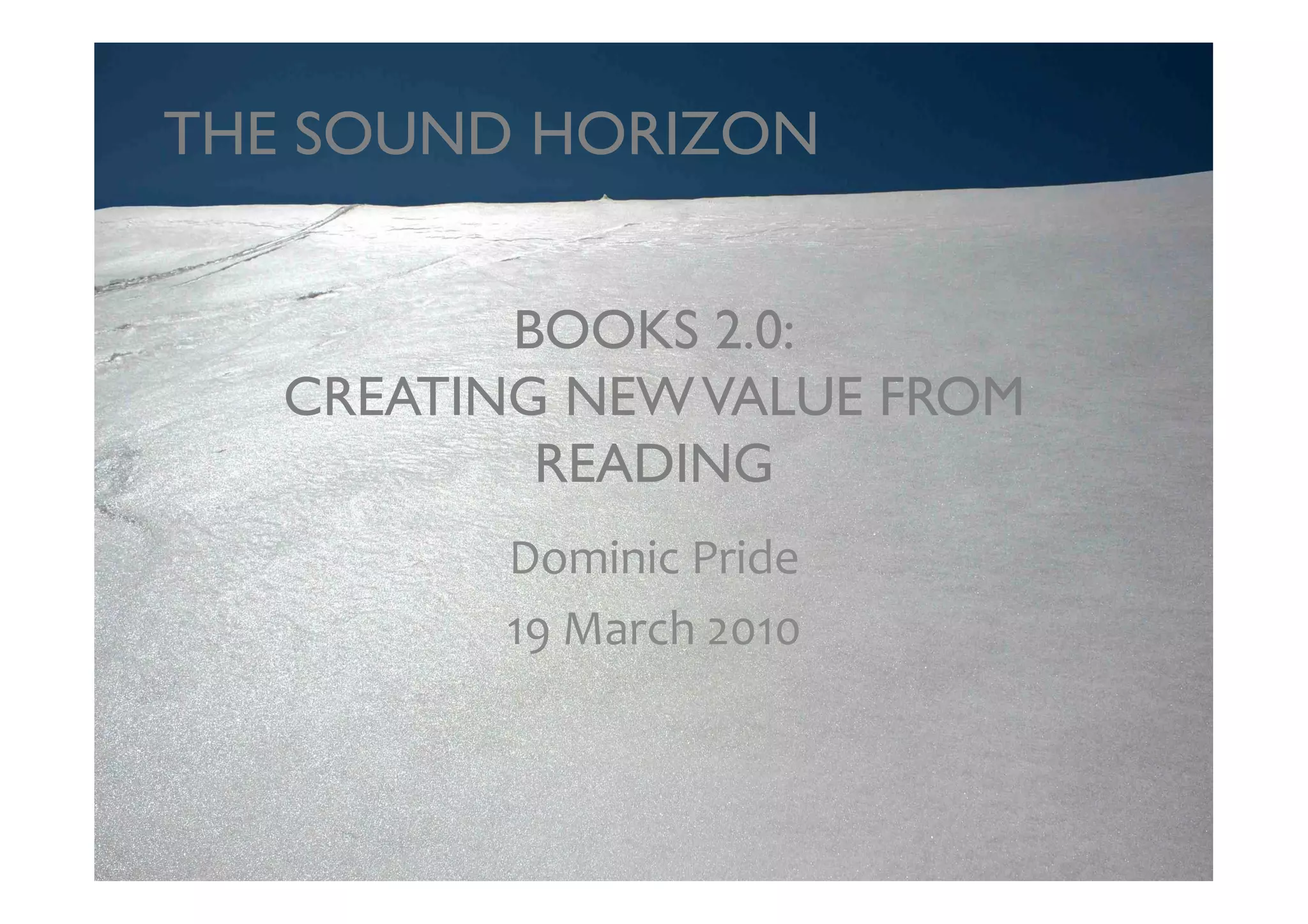 The document discusses the transformation of the publishing industry in the context of digital reading and the emergence of 'books 2.0'. It highlights the challenges posed by digital behaviors, competition from alternative media, and the need for innovation in publishing to thrive in a changing ecosystem. Additionally, it emphasizes the importance of collaboration and adaptation in creating sustainable value for authors and consumers alike.