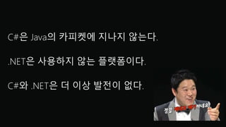 #3 C#은 Java의 카피켓에 지나지 않는다거나, .NET은 쓰는 사람이 없지 않느냐 랄지, C#이나 .net은 더 이상 발전이 없다라는 이야기를 하시는 분이 간혹/자주? 있으신 같습니다.