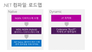뿐만 아니라, .NET의 핵심이라고 할 수 있는 .NET Runtime은 더욱 더 신속하게 기동되고, 더 빠르게 수행되는 코드를 생성할 수 있도록 RyuJIT 이라는 차세대 JIT 컴파일러를 바닥부터 다시 개발하였을뿐 아니라 Roslyn이라고 알려진 .NET Compiler Platform의 개발을 완료하고 차기 버전에 기본 탑재할 예정입니다. C#과 Visual Basic은 혁신의 노력을 이어가고 있으며, 모바일 시대에 가장 적합한 컴파일 모델에 대해 고민하고, 상황에 맞는 dynamic, static 컴파일 모델을 구축하였습니다.