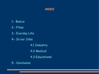The document discusses the future of computing and its impact across various areas of life including films, everyday life, jobs, and concludes with a summary. Computing will continue advancing scientific fields like industry, medicine, and education through technologies like exoskeletons, smart vehicles, and storage. While beneficial advances are predicted, the document also notes potential issues with integrating computing deeply into all aspects of life.