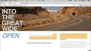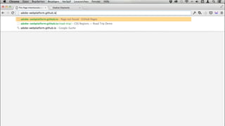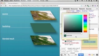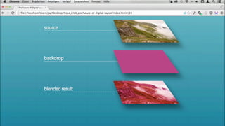 The document discusses advanced CSS features including CSS regions, blending modes, and shapes, focusing on their potential in creating adaptive user interfaces and enhancing web design. It highlights the status of these features as W3C working drafts and mentions tools from Adobe for implementing responsive web designs. Key concepts such as flow regions and background blending are illustrated with example code snippets.