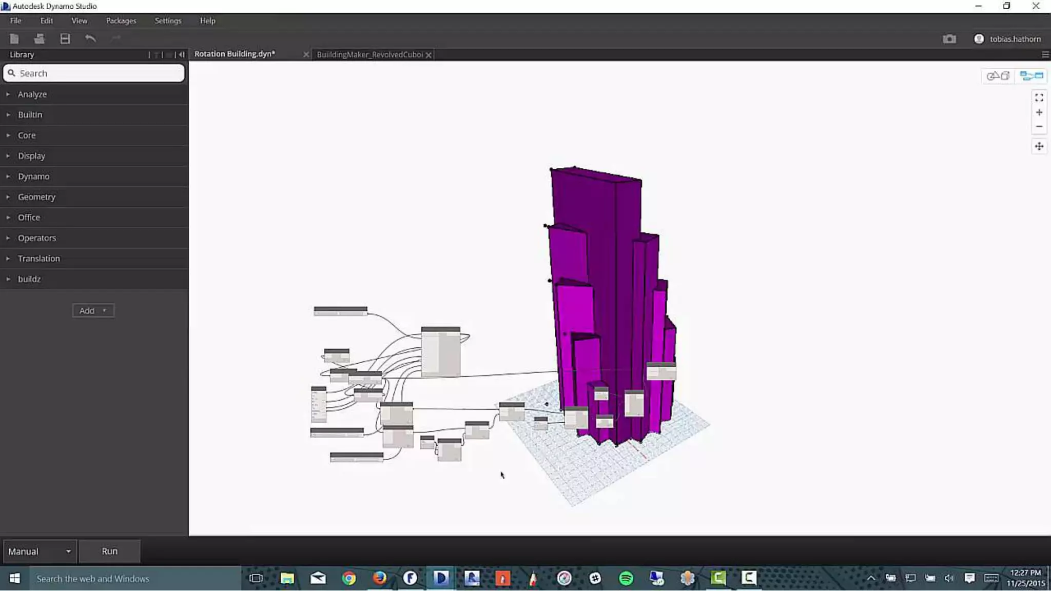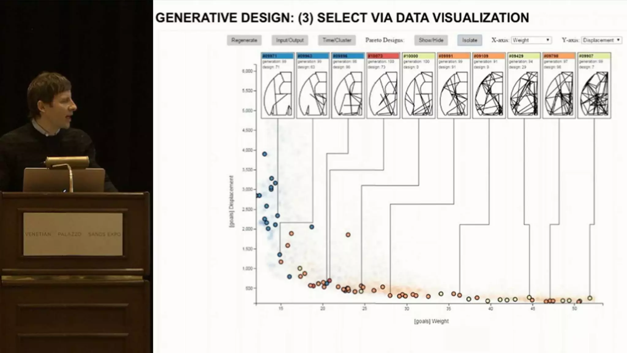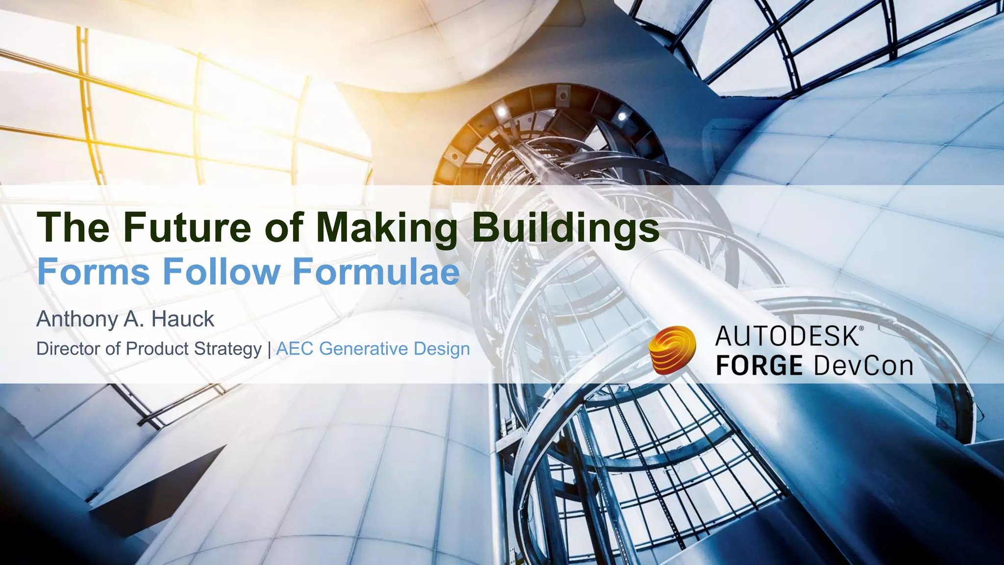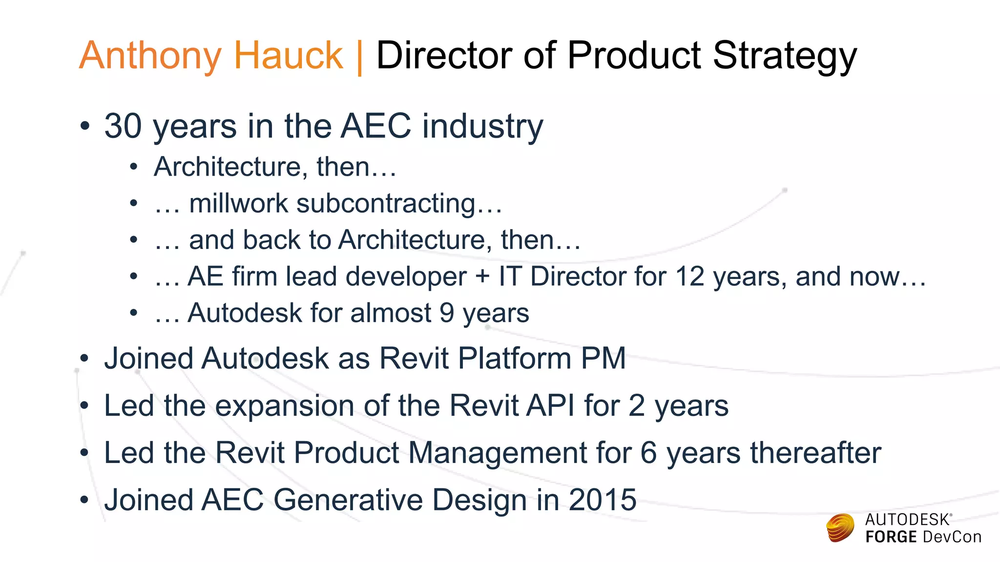 Anthony Hauck, a director at Autodesk with extensive experience in the AEC industry, discusses advancements in generative design that enhance building efficiency and reliability. The document details technical aspects of a generative design system, including computational simulations and parameters for architectural design. It highlights improvements such as reduced fabrication time and increased structural compliance through innovative data structure applications.