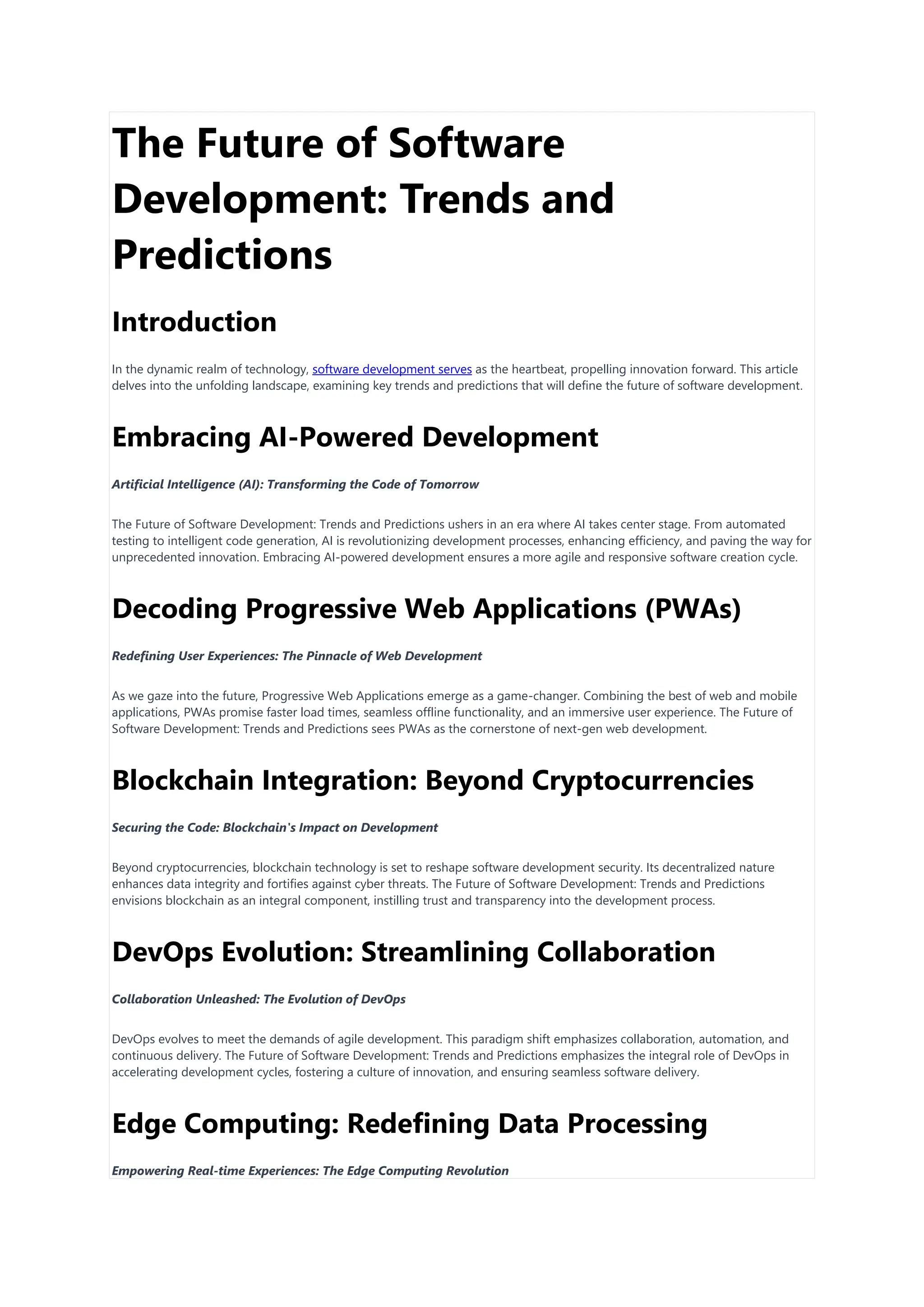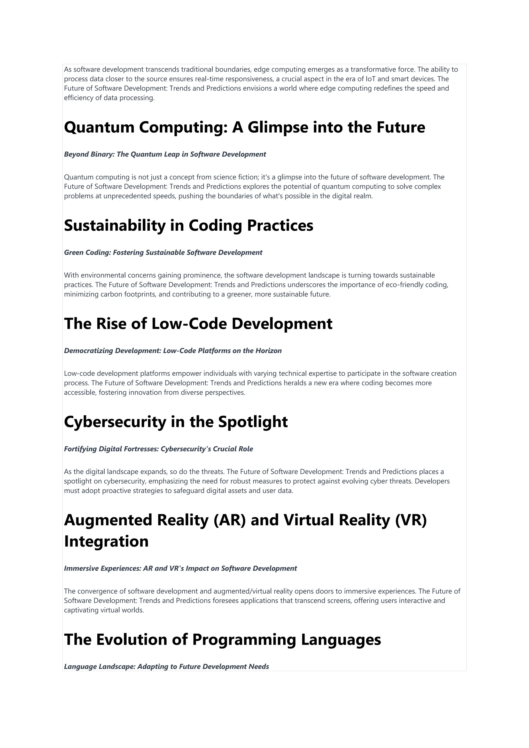 The document outlines key trends and predictions that will shape the future of software development, with a focus on the rise of AI, progressive web applications, and blockchain technology for enhanced security. It emphasizes the importance of DevOps, edge computing, and low-code platforms, as well as sustainable practices and the need for robust cybersecurity measures. The piece also discusses the impact of quantum computing, augmented reality, and the evolution of programming languages, highlighting the essential role of human creativity in coding.