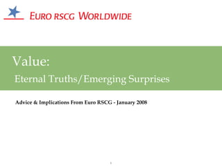 The document provides marketing advice for companies during an economic recession, suggesting that brands should maintain or increase advertising, avoid cutting prices, and focus on innovation. It also examines changing consumer behavior, finding that many consumers are anxious about the future and actively hunting for bargains and value. The research indicates that consumers now associate value more with quality, trustworthiness, and customer service rather than just low price.