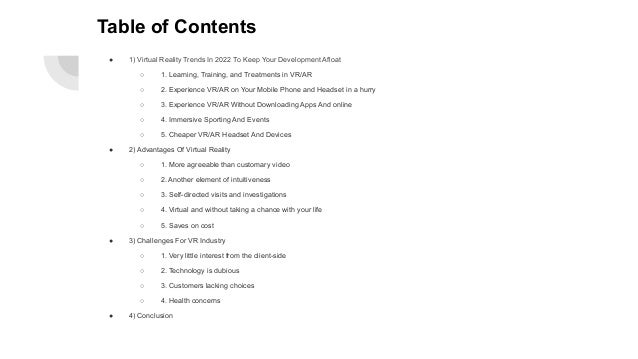The document discusses trends and advantages in virtual reality (VR) development for 2022, highlighting increased applications in healthcare, immersive experiences, and enhanced mobile accessibility. It addresses challenges faced by the VR industry, including low consumer interest, limited technology adoption, and health concerns, while emphasizing the potential future growth of VR technology in various sectors. The conclusion underscores the promising prospects of VR as advancements in technology progress, despite existing hurdles.