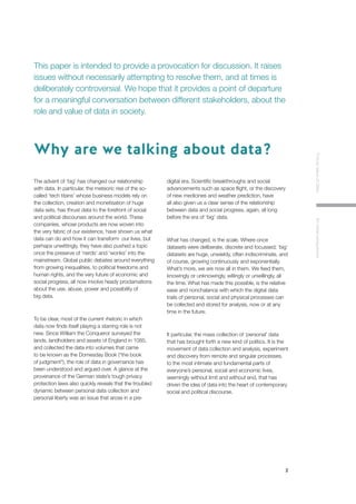 1) The document discusses the changing relationship between data and society due to the rise of big data and tech companies that rely on collecting and monetizing large datasets. This has thrust data into political and social debates around issues like privacy, economic inequality, and human rights.