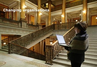 The document discusses the evolving landscape of work and workplace management, emphasizing the need for agility in organizations as they adapt to new technologies and multi-locational work styles. It highlights the growing trend of mobile and teleworking, shifts in customer service methods, and the impact of an aging workforce on public administration. Additionally, it underscores the importance of sustainable building practices and user involvement in workplace design to enhance productivity and well-being.