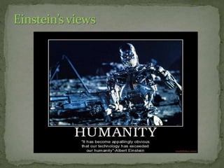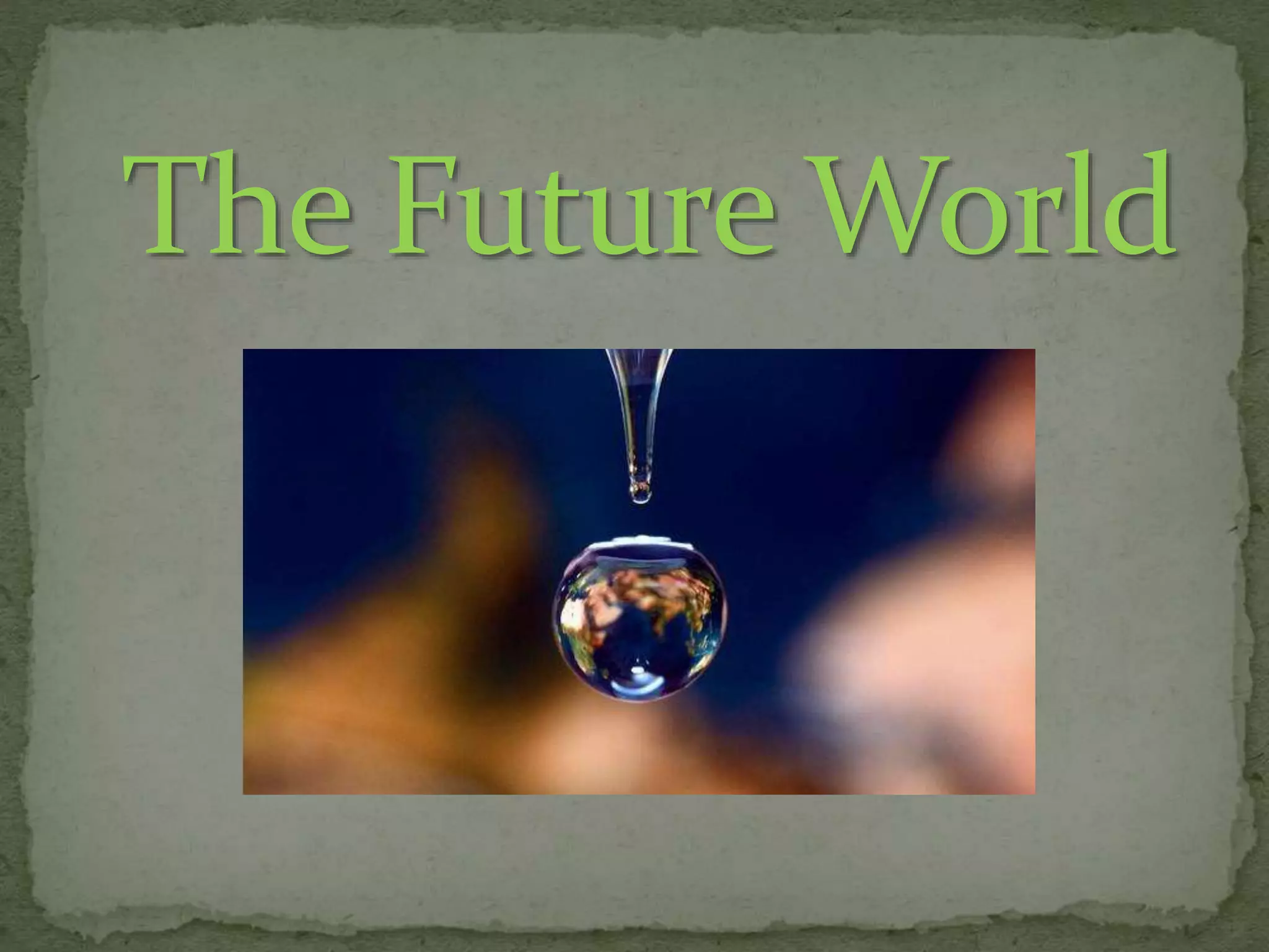 The document discusses predictions for several fields in the future world including communication, medicine, cities, transport, food, wars, and the environment. Communication is predicted to become more accurate and advanced through technologies like cell phones and social networks. Medicine may see real-time patient monitoring, earlier disease diagnosis, and increased life expectancy for conditions like AIDS. Cities are envisioned as very large but compact with state-of-the-art infrastructure. Transport could include frictionless and fully automated vehicles with silent engines. However, threats from environmental disasters, food crises, and advanced weapons in wars pose risks to humanity.