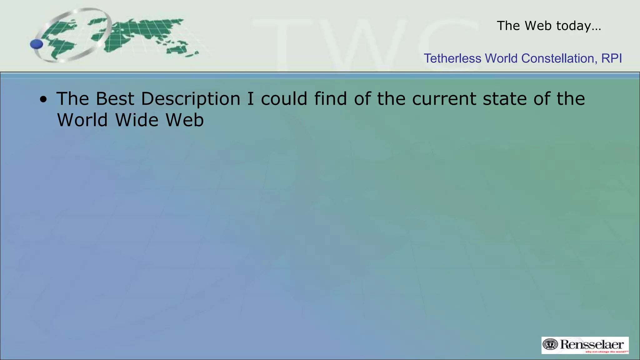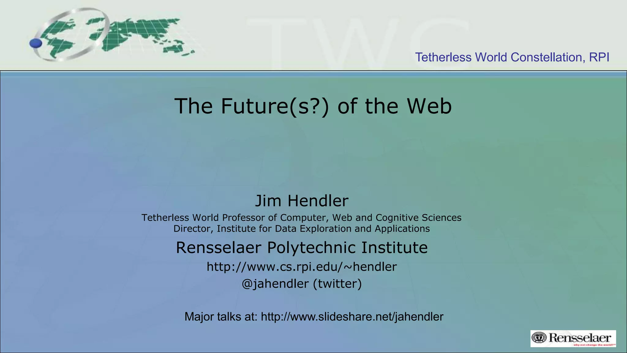 The document discusses the evolution of the web, emphasizing the distinction between the internet and the web, with the latter focusing on human communication and information sharing. It highlights the challenges posed by competition among technology companies leading to a fragmented web, as well as the potential for an open web reclaimed through human rights advocacy and legislative efforts. The author calls for web scientists to engage in effective communication and influence policy to foster a better future for the web.