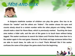 This document summarizes several traditional games that were popular among children in Bulgaria in past generations. It describes the rules and objectives of games like hide-and-seek, tag, broken phone, dodgeball, blind man's buff, jumping rope, wishbone, tell me oracle, white butterflies, burn handkerchief, rubber band jumping, hopscotch, draughts, giants and dwarves, and balls. These games required little equipment and helped entertain children before the prevalence of electronic devices.