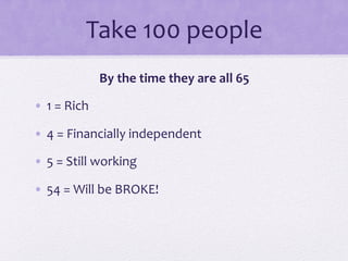 This document discusses how people can achieve success and financial independence. It notes that by age 65, of 100 people, only 1 will be rich, 4 financially independent, 5 still working, and 54 will be broke. It argues that most people conform to following the paths of the 95% who do not succeed, rather than thinking differently. It advocates deliberately choosing your path in life and controlling your mindset, believing you can achieve your goals by focusing on them daily and acting as if you have already succeeded.