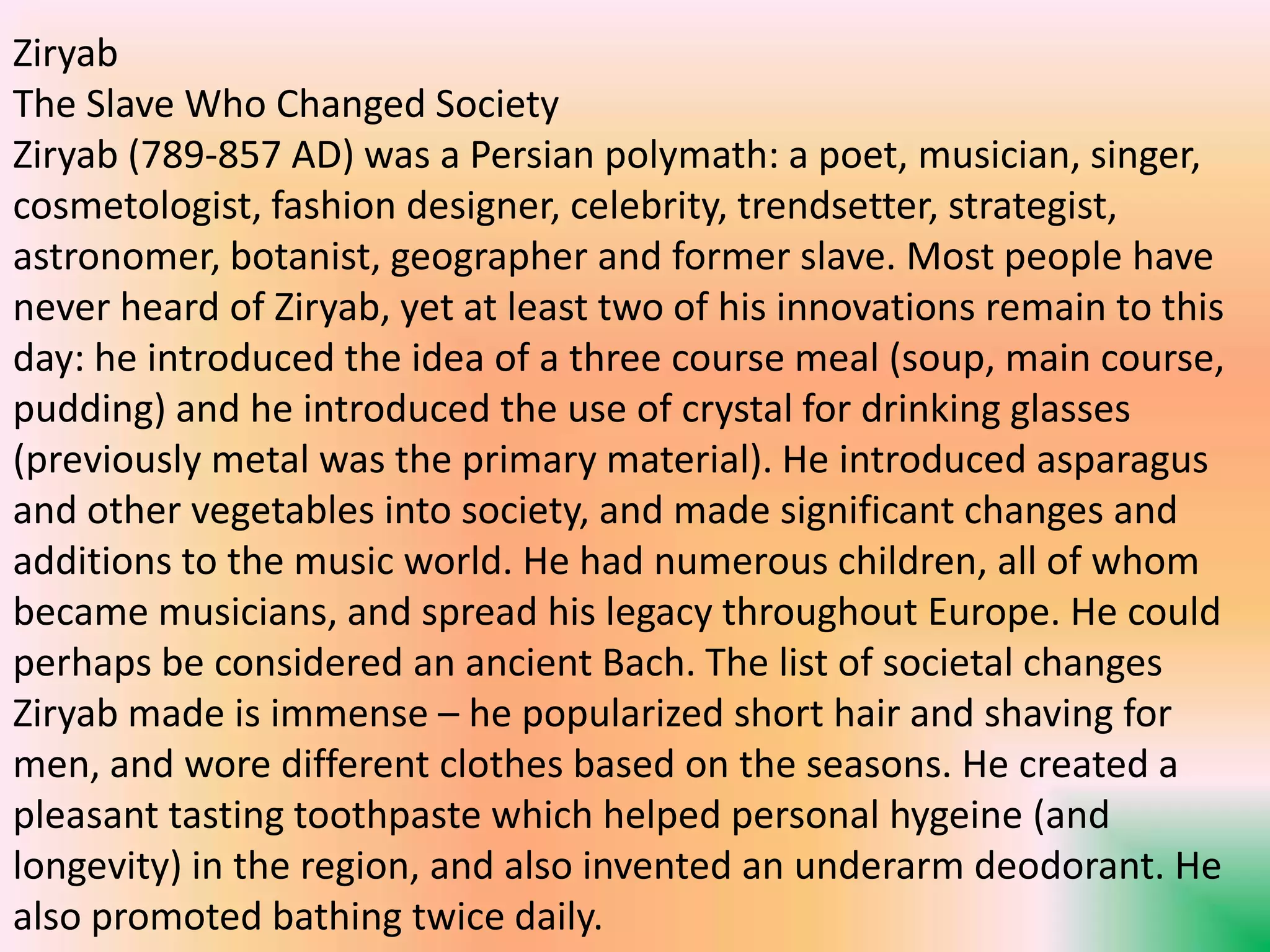 Ziryab (789-857 AD) was a Persian polymath: a poet, musician, singer,