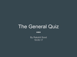 This document outlines the rules and format for "The General Quiz", including that star marked questions will give an advantage in ties, prompting answers or using devices during the quiz will result in disqualification, and the quizmaster's decision is final. It then provides a sample quiz with multiple choice questions on various topics to test general knowledge.