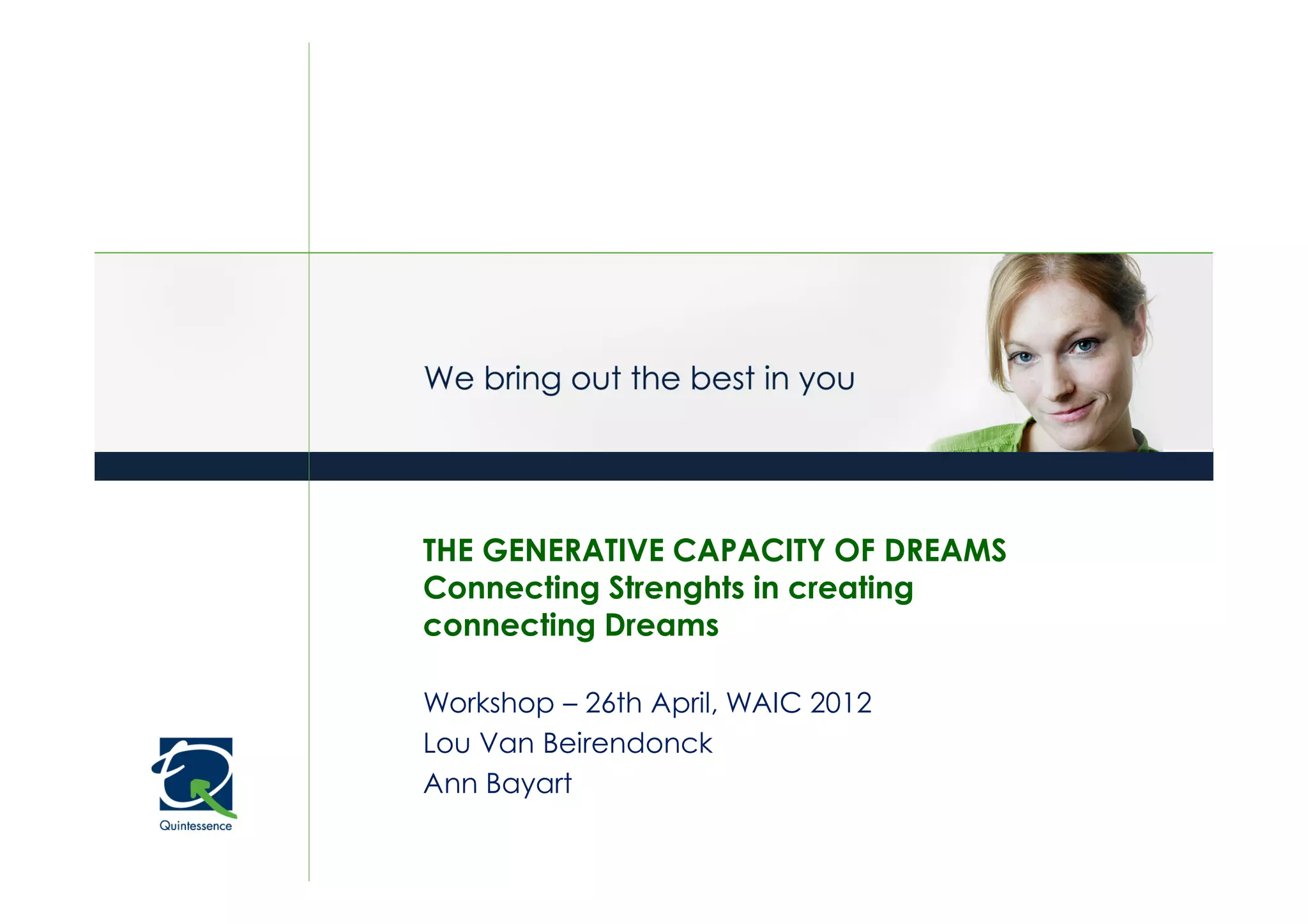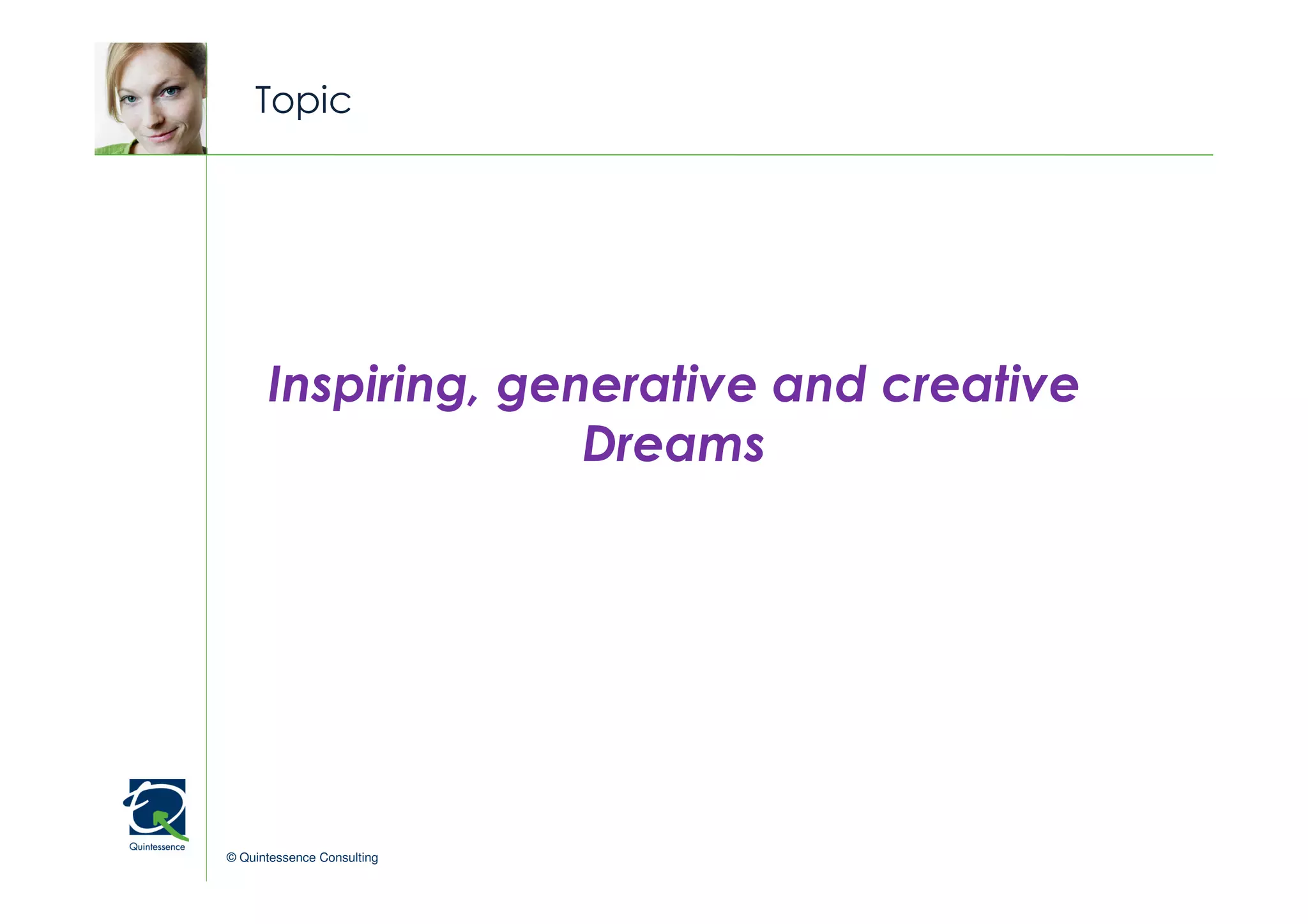 The document discusses facilitating generative dreams and increasing creativity. It provides questions to guide facilitators in encouraging thinking outside limits and increasing attunement. Several discovery exercises are described to mine for creative ideas, including imagining interventions that increased generative dreaming. The workshop results list many tools and techniques facilitators can use to help people connect and dream, such as meditation, role playing, improvisation, humor, and focusing on strengths and meaning.