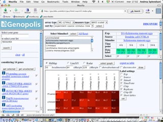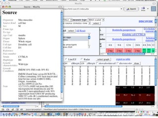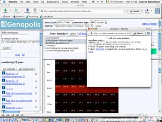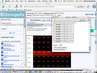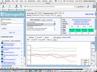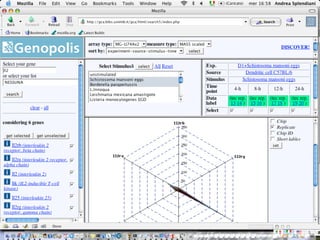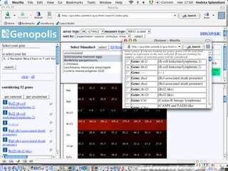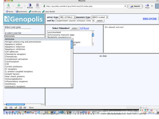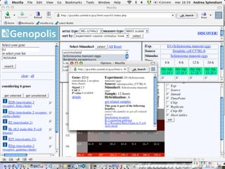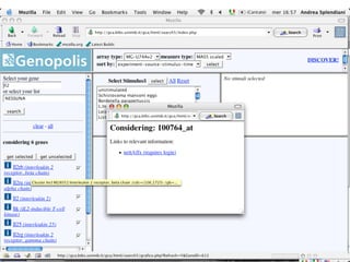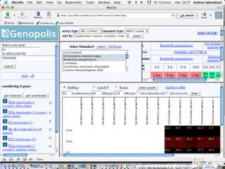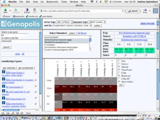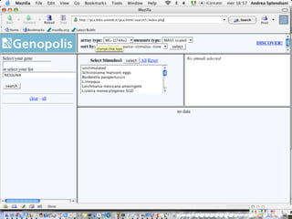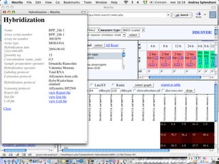 The document outlines the design and implementation of a community microarray database developed for the Genopolis Consortium in Milan, aimed at supporting research on immune cell behavior and gene expression. It discusses aspects such as information modeling, annotation processes, data access, and different roles within the user community. The database supports Affymetrix gene expression data, emphasizes self-categorization through controlled vocabularies, and integrates functionalities for both data input and retrieval.