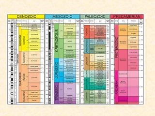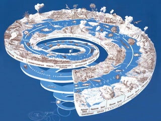 The geological time scale records 4.6 billion years of Earth's history divided into eras, periods, and epochs based on studying rock layers and fossils. It begins with the Precambrian era which covers 88% of Earth's history. The timescale includes the Paleozoic era of ancient life dominated by invertebrates like trilobites; the Mesozoic era of middle life dominated by dinosaurs and the breakup of Pangaea; and the ongoing Cenozoic era of recent life dominated by mammals including the evolution of humans.