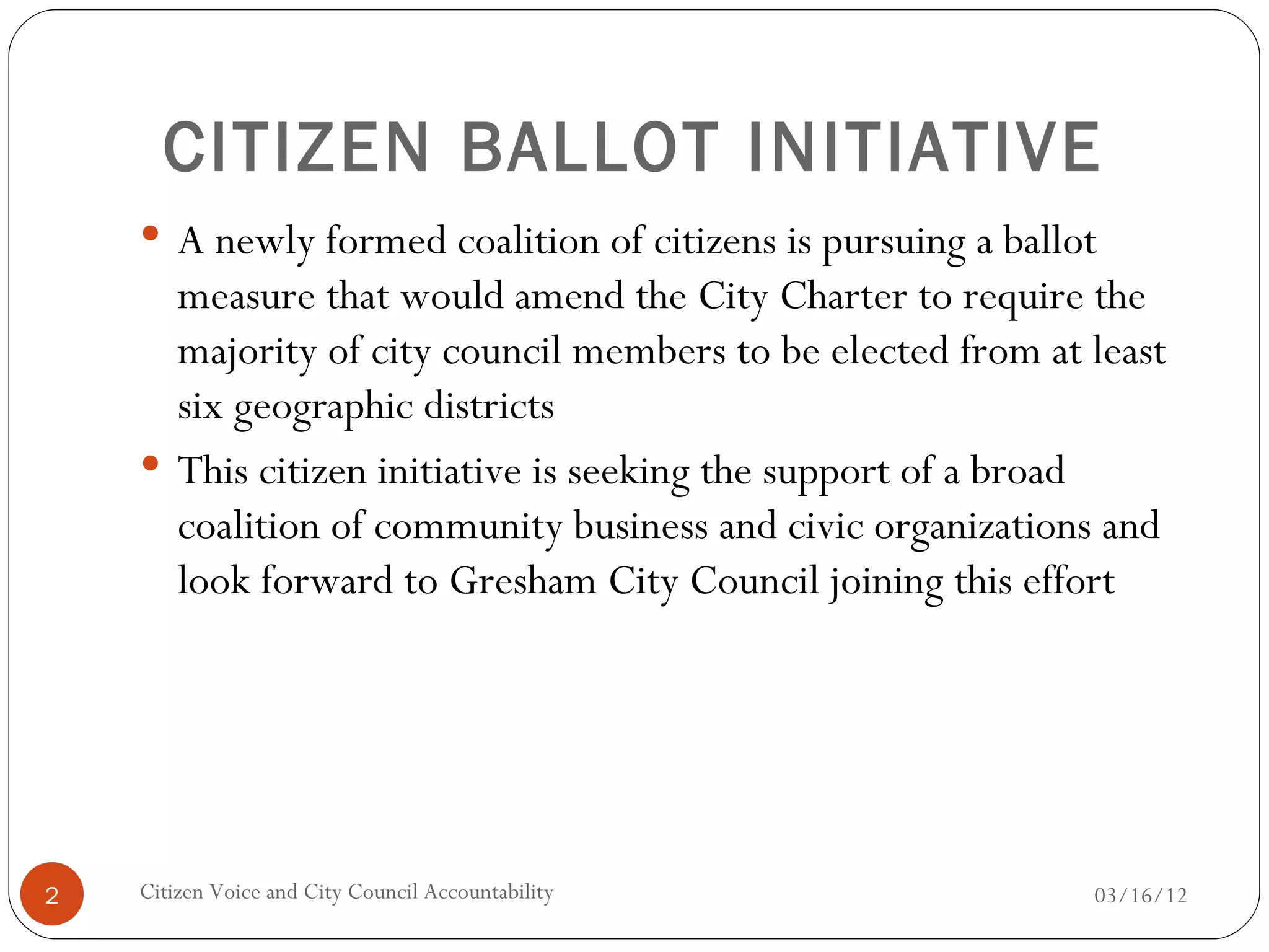A citizen coalition in Gresham, Oregon is pursuing a ballot measure to amend the city charter to require city council members to be elected from at least six geographical districts. Currently, the majority of the city council lives in one neighborhood, leaving many parts of Gresham without proper representation. In 1986, Gresham voters approved electing city councilors at-large instead of from districts, concentrating political power among certain neighborhoods. The proposed amendment aims to increase citizen involvement and accountability of representatives to specific areas.