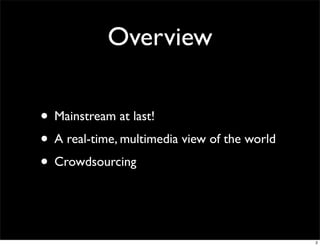 The document discusses the growing mainstream adoption of geospatial technologies. It notes that geospatial data is now easily accessible and integrated into many applications as just another data type. Crowdsourcing of geospatial data through projects like OpenStreetMap is allowing much more comprehensive and up-to-date maps to be created at a fraction of the traditional cost. The widespread availability of location sensing technologies and real-time geospatial data is enabling new applications and use cases across many domains.