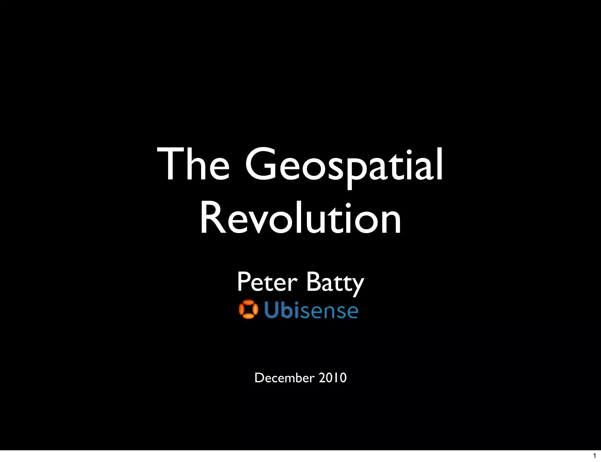 The document discusses the geospatial revolution and the evolution of geospatial data, emphasizing the impact of mainstream technologies and crowdsourcing on GIS applications. It highlights the shift toward location-based services and the increasing role of the cloud in data management and scalability. The document also touches on data quality concerns and the growing importance of user-generated data in map creation.