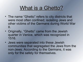 1) A ghetto is an isolated city district where Jews and other victims were confined by Germans during World War II, originally coming from the Jewish quarter in Venice in 1516 that segregated Jews from non-Jews.