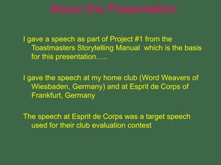 The document outlines a storytelling speech given by Darryl Heron about Shel Silverstein's 'The Giving Tree,' which explores themes of love, sacrifice, and the impact of human actions on nature. It discusses the bittersweet relationship between the tree and the boy, prompting reflections on parental sacrifices and environmental stewardship. The presentation aims to connect emotionally with the audience and encourage them to consider the deeper meanings of the story.