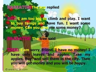 The tree loved a boy and was happy when the boy would play in its branches. As the boy grew older, he used the tree for different needs - first cutting its branches to build a house, then cutting down its trunk to make a boat. Each time, the tree was sad to lose parts of itself but wanted to make the boy happy. When the boy returned as an old man just wanting rest, the tree welcomed him to sit on its remaining stump.