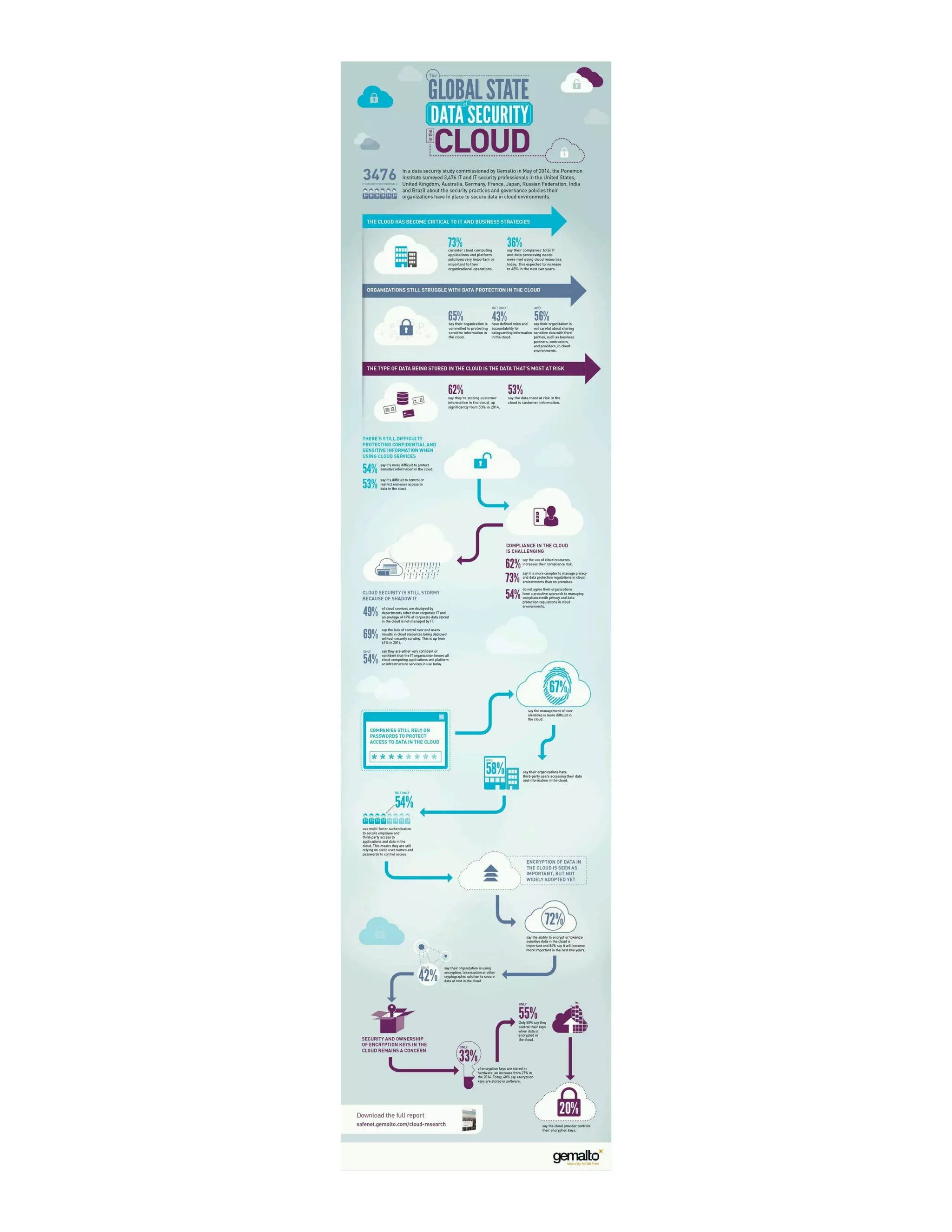 The Global State of Data Security in the Cloud by Gemalto The cloud has become critical to IT and Business strategies Organisations still strugle with data protection in the cloud The type of data stored in the cloud is the data that's most at risk