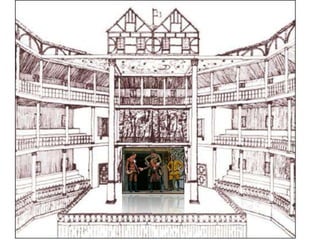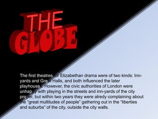 The document discusses early Elizabethan drama theaters which took place in inn-yards and great halls, influencing later playhouses. Civic authorities in London were unhappy with performances in city streets and inn-yards so plays moved just outside the city walls, where authorities still complained about large crowds gathering in the "liberties and suburbs."