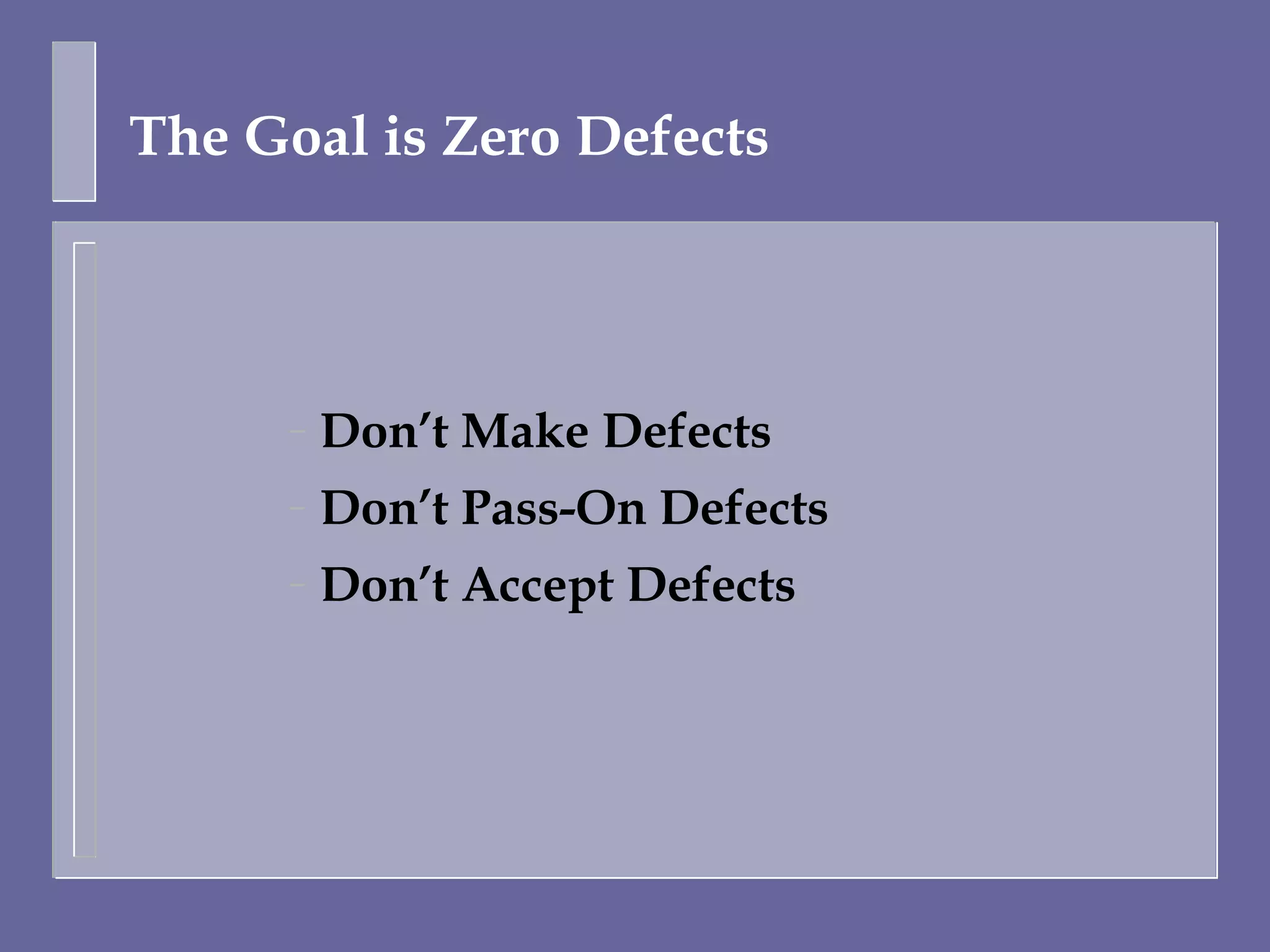 The document outlines a goal of zero defects by not making defects during production, not passing defects to downstream processes, and not accepting defective products or components from suppliers.
