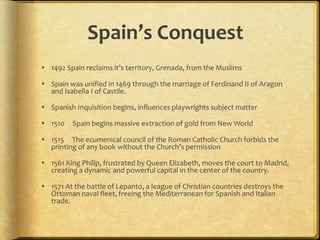 Spain unified in 1469 through the marriage of Ferdinand II of Aragon and Isabella I of Castile, laying the foundations for its conquests and Golden Age. In the 1500s, Spain began extracting gold from the New World, established the Spanish Inquisition, and defeated the Ottoman navy at Lepanto. The Spanish Golden Age of theater then began in the late 1500s, sparked by playwrights like Lope de Vega and Cervantes, before declining in the 1600s due to wars and the death of key figures like Cervantes and Calderon de la Barca.