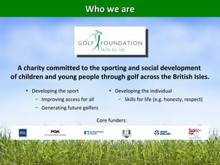 The Growth of Grass Roots Junior Golf is a charity committed to developing children and young people through golf. It runs HSBC Golf Roots, a national program that uses golf to teach life skills like honesty and respect. The program partners with schools, golf clubs, and local authorities to introduce golf to over 1 million children per year through initiatives like Tri-Golf and Golf Xtreme. It is seeking additional funds to continue expanding its efforts to develop the sport and individuals.