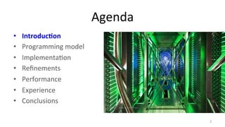 Agenda • Introduc4on • Programming model • Implementa8on • Refinements • Performance • Experience • Conclusions 2