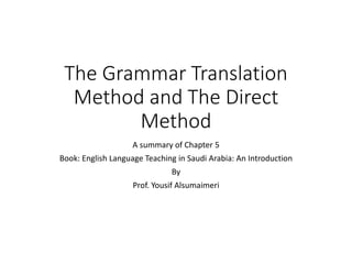 Chapter 5 of 'English Language Teaching in Saudi Arabia' discusses two primary methods: the Grammar Translation Method and the Direct Method. The Grammar Translation Method focuses on grammar rules and accuracy, emphasizing reading and writing, but neglects oral skills, while the Direct Method prioritizes speech and real-life vocabulary at the expense of reading and writing skills. Each method has its advantages and shortcomings, highlighting the challenges of language teaching.
