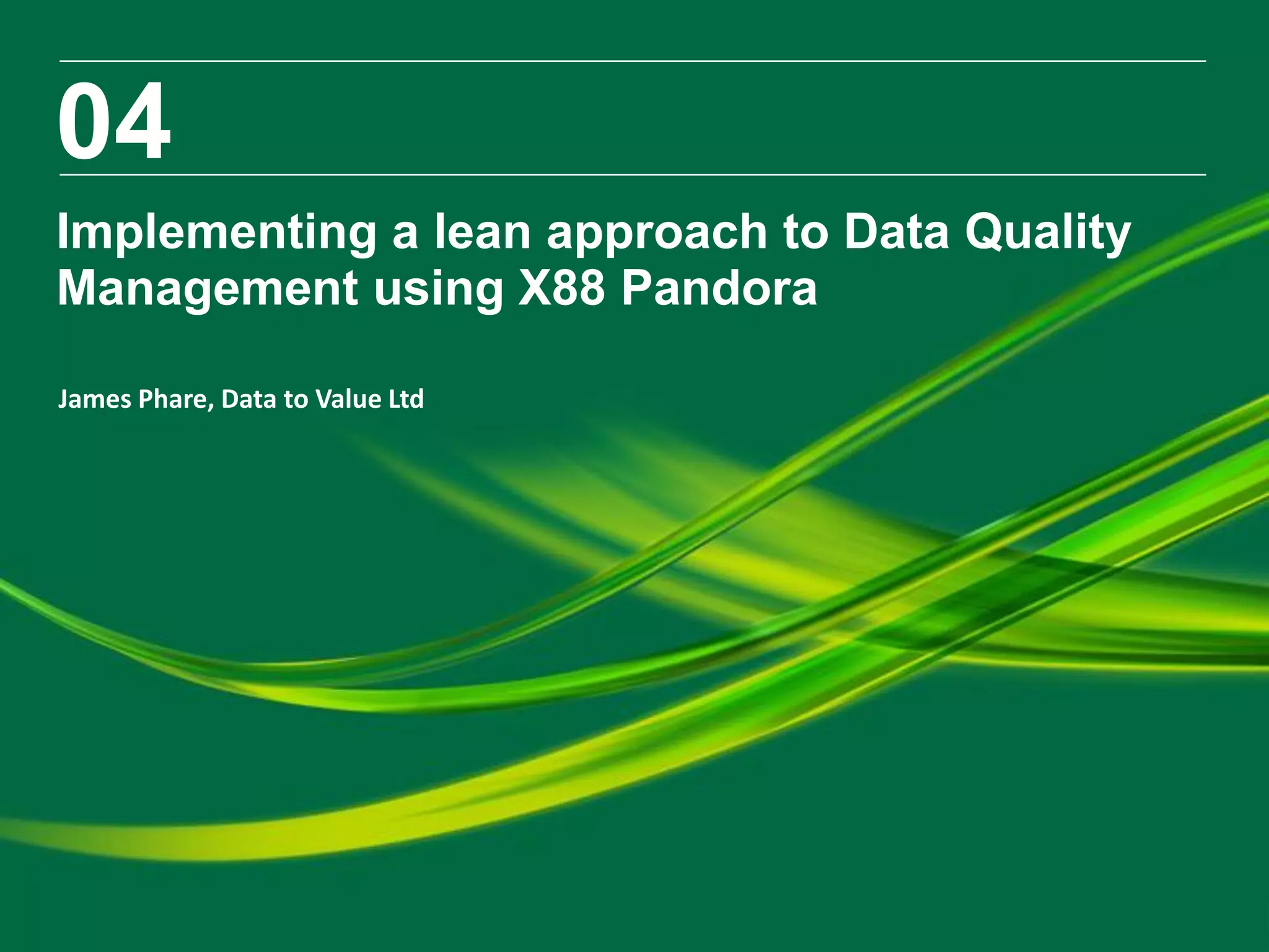 The document discusses implementing a lean approach to data quality management using the x88 Pandora tool, addressing the need for effective data quality assessment and governance. It highlights challenges, results, and the pilot project's outcomes, including significant improvements in data quality and reduced maintenance costs. The emphasis is on creating a competency center in data quality management and fostering positive attitudes towards data quality practices.