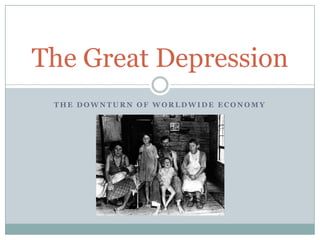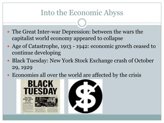 The document discusses the worldwide Great Depression that began with the 1929 crash of the New York Stock Exchange. It describes how economies around the world were affected by the crisis as demand could not keep up with overproduction. The overexpansion of consumer credit contributed to the economic collapse. Both Roosevelt and Hitler rose to power during this period by promising to revive their countries' economies and lead their desperate people, though Hitler took it to an extreme.
