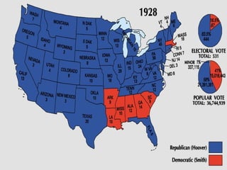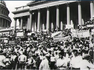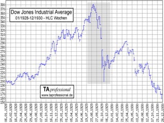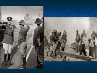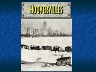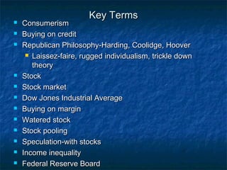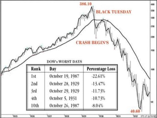 The document provides background information on the Great Depression and the stock market crash of 1929. It discusses key terms, events, causes and effects of the period. Specifically, it outlines how speculation in the stock market led to inflated stock prices that eventually crashed in October 1929. This crash had widespread effects, causing banks to fail, businesses to cut production and lay off workers, and unemployment to rise sharply. Together these events marked the beginning of the Great Depression, a severe worldwide economic downturn that lasted through the 1930s.